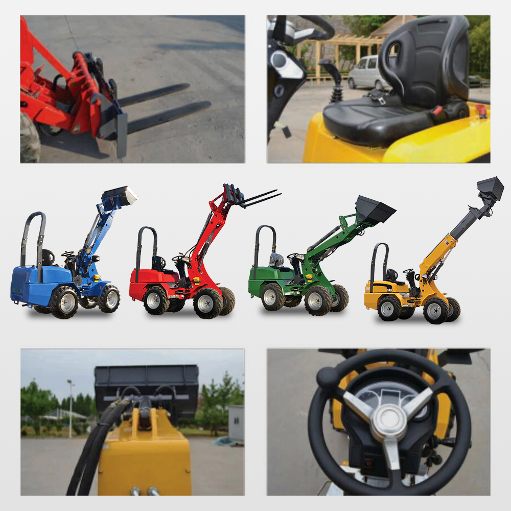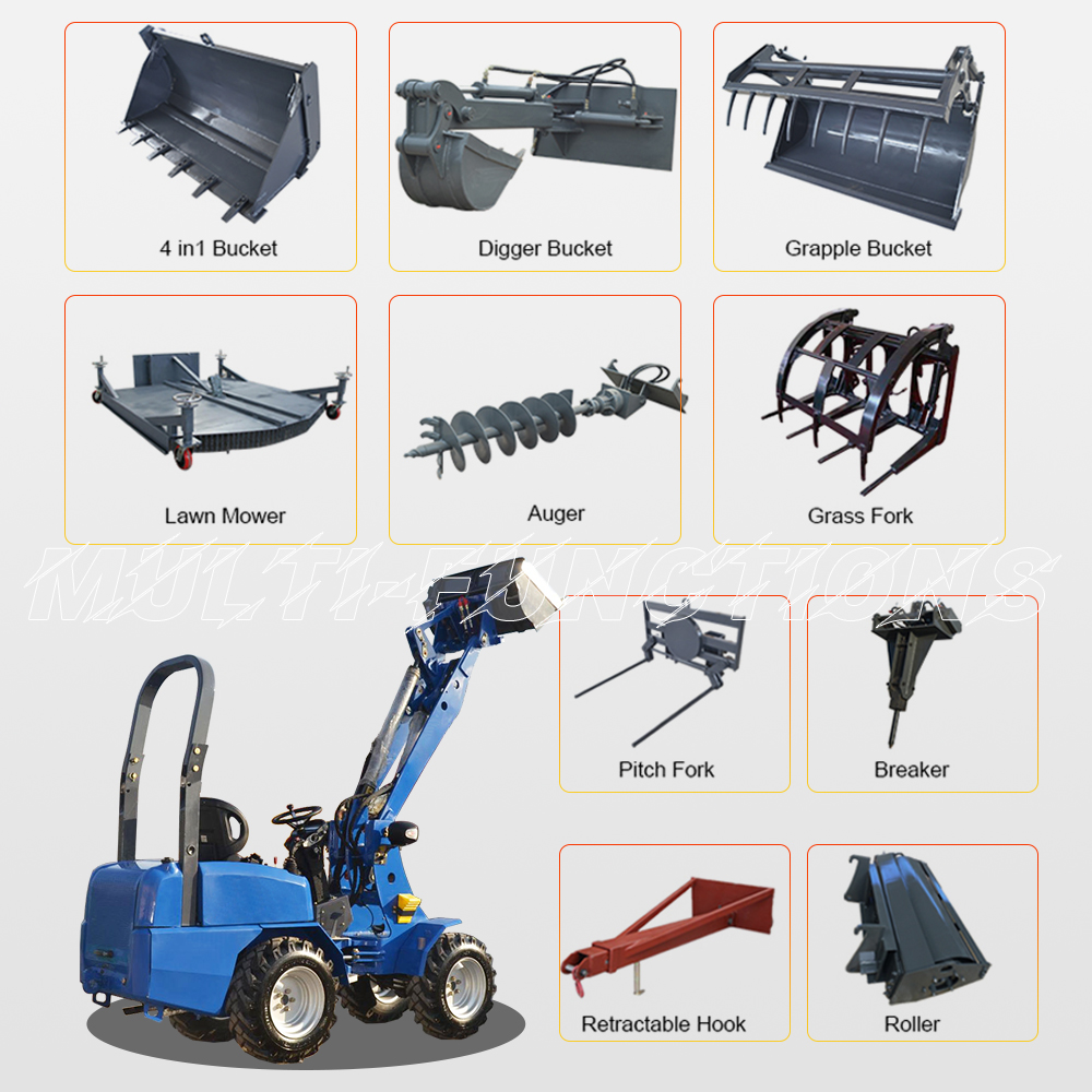 Grass fork, Snow sweeper, Auger, Snow blade, Snow bucket, Pallet fork, Screening bucket, 4 in 1 bucket and other attachments can be installed on the compact wheel loader to realize different functions.