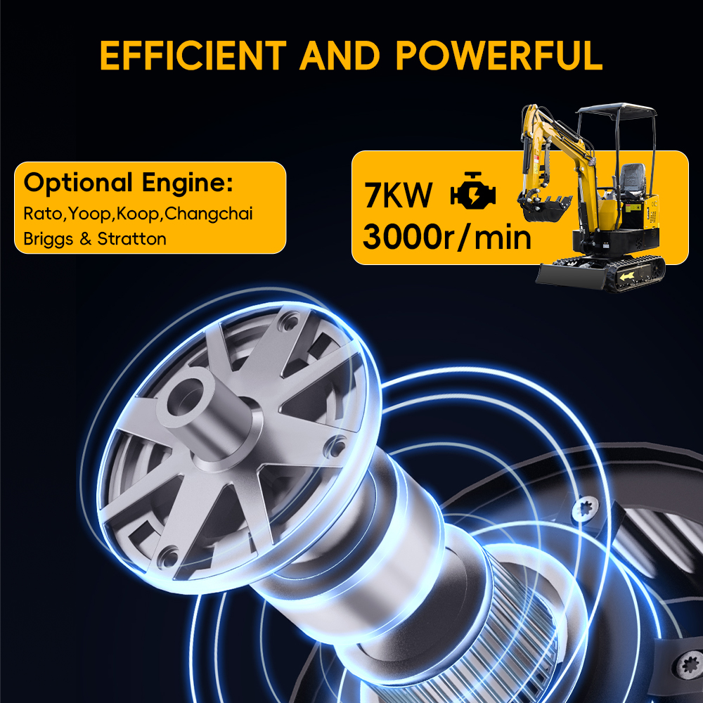 Cette mini-pelle est équipée d'un moteur RATO 15HP de première qualité d'une puissance maximale de 9,5KW pour un fonctionnement puissant mais économe en carburant et une distribution supérieure de la chaleur. Dites adieu aux vibrations grinçantes, savourez un fonctionnement sans faille et anticipez sa longévité.
