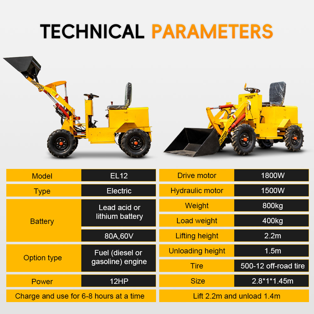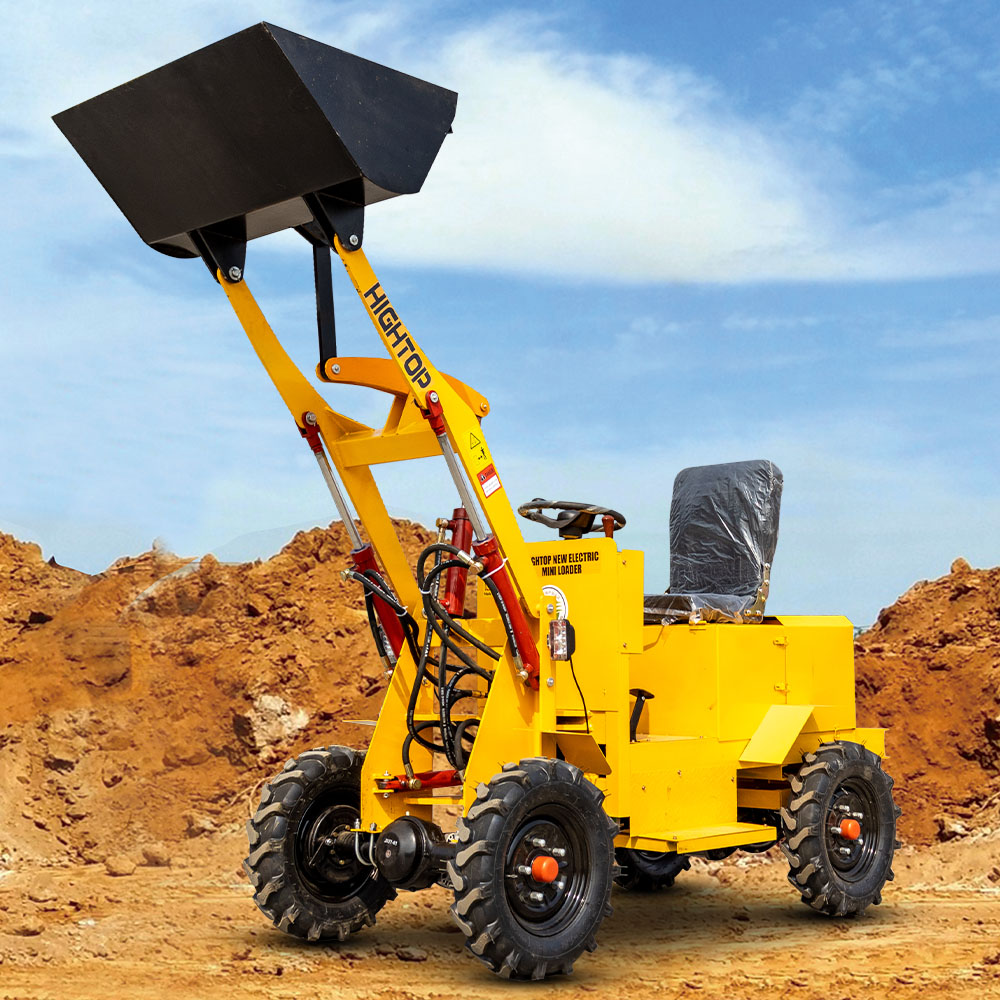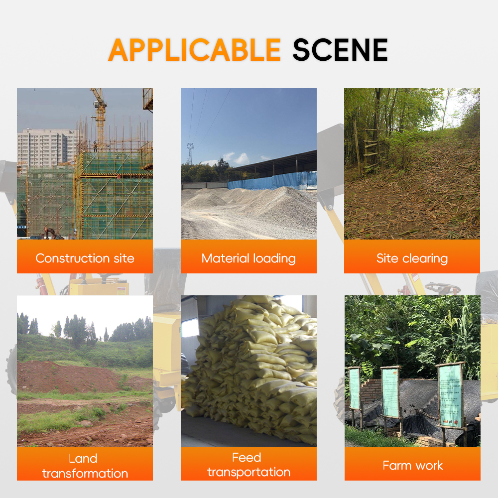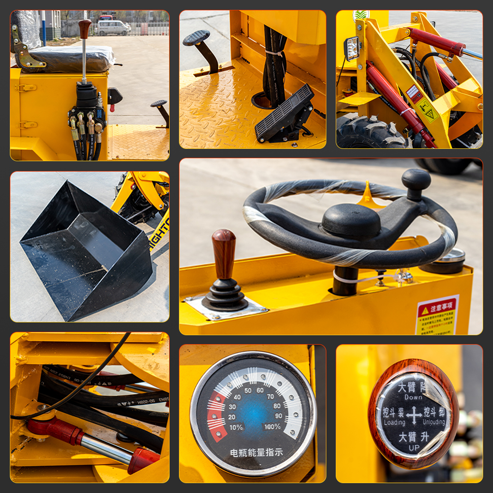 Le moteur d'entraînement de 1800 W fournit une puissance élevée, permettant à la chargeuse compacte sur pneus de conserver de bonnes performances de conduite et de fonctionnement, même lorsqu'elle transporte de lourdes charges ou qu'elle se trouve sur un terrain difficile.