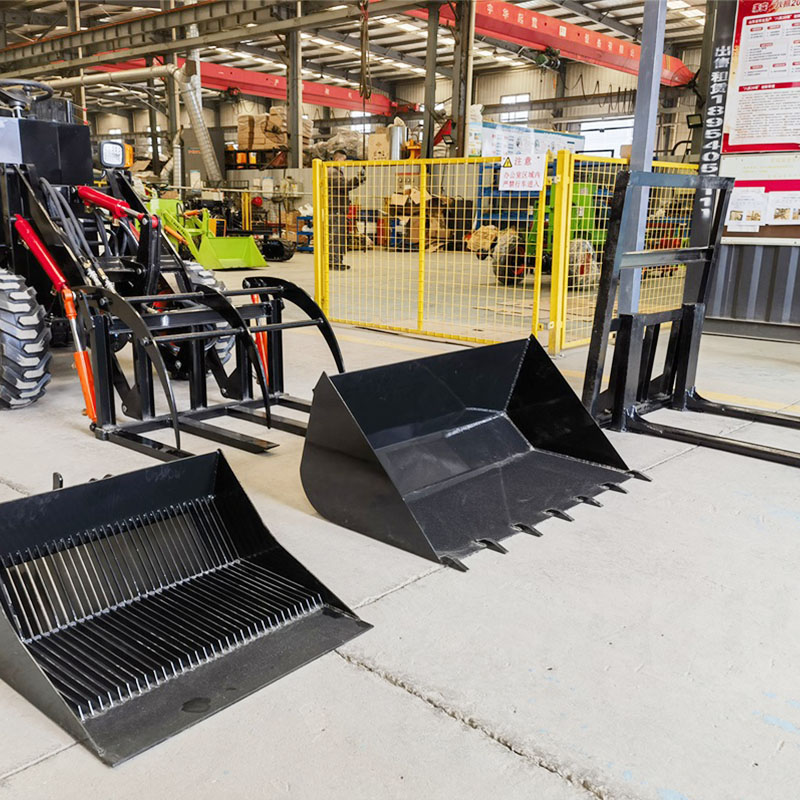 La fourche à herbe, la balayeuse à neige, la tarière, la lame à neige, le godet à neige, la fourche à palette, le godet de criblage, le godet 4 en 1 et d'autres accessoires peuvent être installés sur la chargeuse compacte sur pneus pour réaliser différentes fonctions.